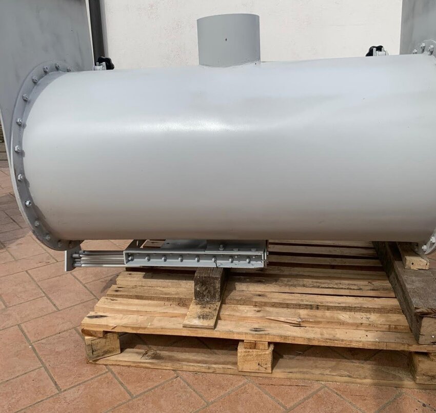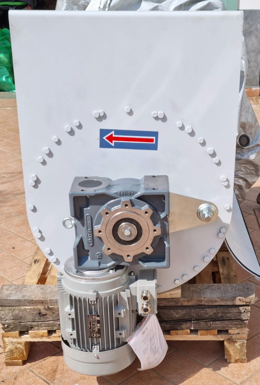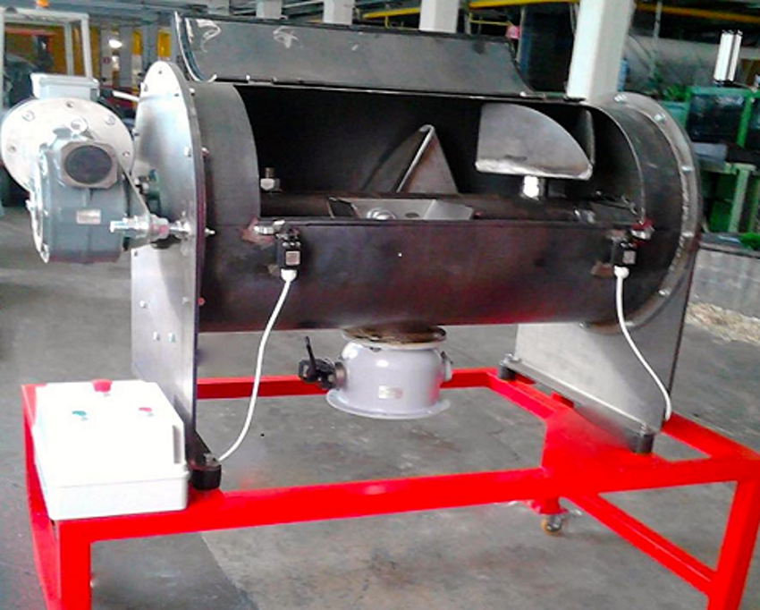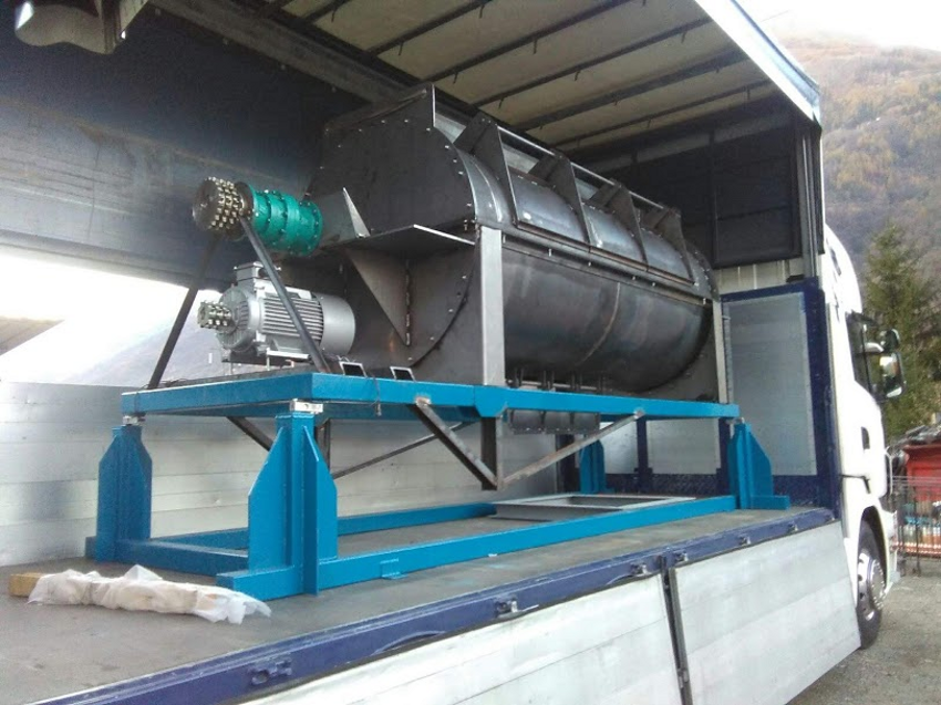 Adatto a mescolare ed omogeneizzare prodotti polverulenti e in granulo da una una portata di 100 a 5000 Lt. La struttura è costituita da lamiera di ferro 30/10 per quanto riguarda la cassa, opportunamente calandrata ed imbullonata tramite flange da 100/10 che permettono una migliore funzionalità della macchina, evitando in tal modo le vibrazioni. Internamente è composta da vomeri in piatto Fe360 disposti in modo elicoidale sull’albero sostenuto ai lati da due cuscinetti regolabili, in modo da garantire ai prodotti un movimento anaerobico e quindi la miscelazione degli stessi. Il moto avviene mezzo motoriduttore di marca primaria a trasmissione diretta attraverso l’utilizzo di un riduttore pendolare. Sorretto da una struttura portante in tubolare ad altezza ideale per l’applicazione di un eventuale altro collegamento. Serranda posizionata sul lato anteriore del miscelatore con grandezza adeguata per ottenere uno scarico idoneo alle necessità del cliente, che può essere elettrica o pneumatica completa di microswitch di sicurezza. Coperchio superiore imbullonato, dotato di sportello posizionato sul coperchio per dare la possibilità all’operatore di aggiungere manuali di prodotto. Il trattamento superficiale è realizzato in vernice epossidica su fondo antiruggine.