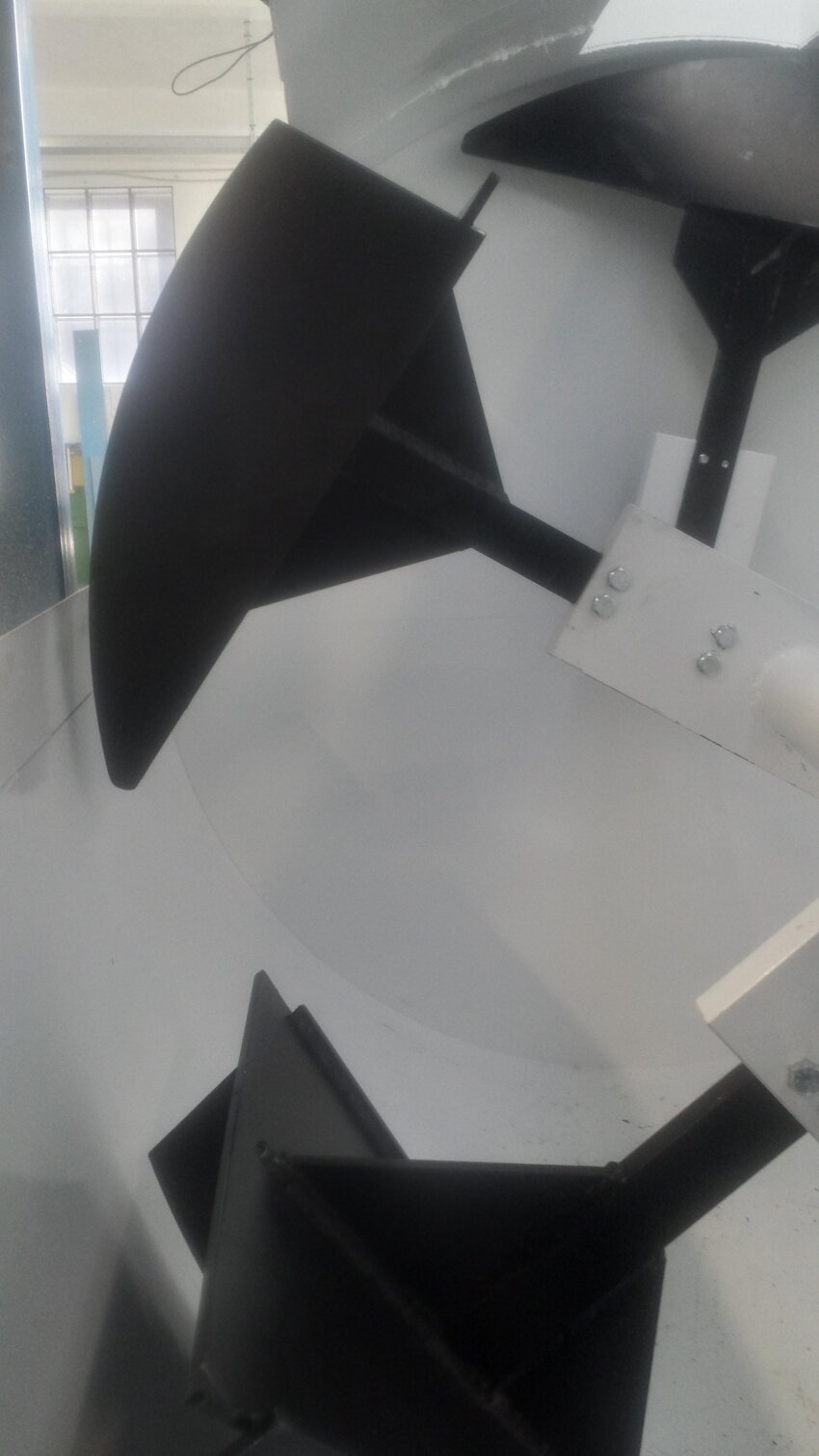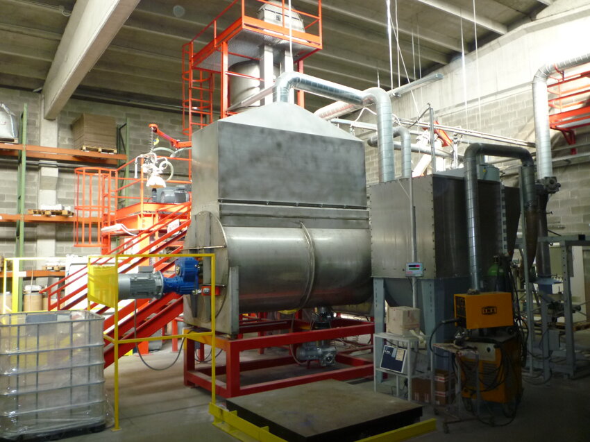 Adatto a mescolare ed omogeneizzare polverulenti e in granulo fino ad una portata da5 a50 qli. La struttura è costituita da lamiera di ferro 30/10 per quanto riguarda la cassa, opportunamente calandrata ed imbullonata tramite flange da 100/10 che permettono una migliore funzionalità della macchina, evitando in tal modo le vibrazioni. Internamente è composta da due aspi concentrici in piatto Fe360 con sensi di rotazione opposti fissati su un unico asse sostenuto ai lati a due cuscinetti regolabili, ino modo da garantire ai prodotti un movimento rotatorio e traslatorio e quindi la miscelazione degli stessi. Il moto avviene mezzo motoriduttore di marca primaria a trasmissione diretta attraverso l’utilizzo di un riduttore pendolare. Sorretto da una struttura portante in tubolare ad altezza ideale per l’applicazione di un eventuale altro collegamento. Serranda posizionata sul lato anteriore del miscelatore con grandezza adeguata per ottenere uno scarico idoneo alle necessità del cliente, che può essere elettrica o pneumatica completa di microswitch di sicurezza. Coperchio superiore imbullonato, dotato di sportello posizionato sul coperchio per dare la possibilità all’operatore di aggiungere manuali di prodotto. Il trattamento superficiale è realizzato in vernice epossidica su fondo antiruggine. Su richiesta è possibile realizzare la macchina anche in acciaio inox.